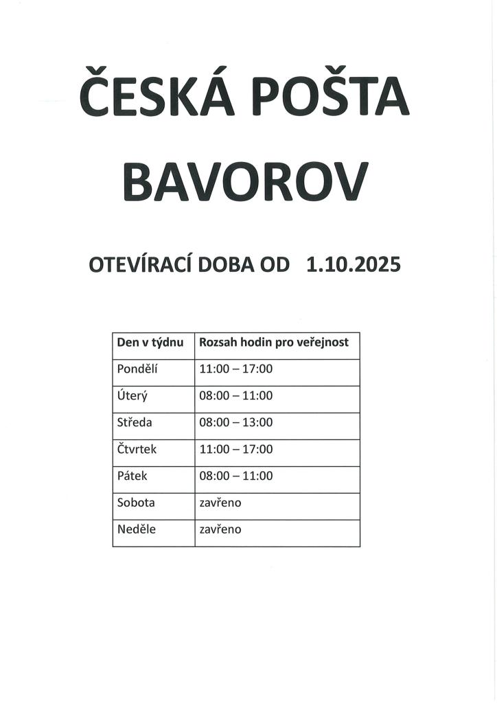Česká pošta informuje o změně provozovatelky pošty Partner Bavorov. Novou provozovatelkou bude paní Eva Krčmářová.